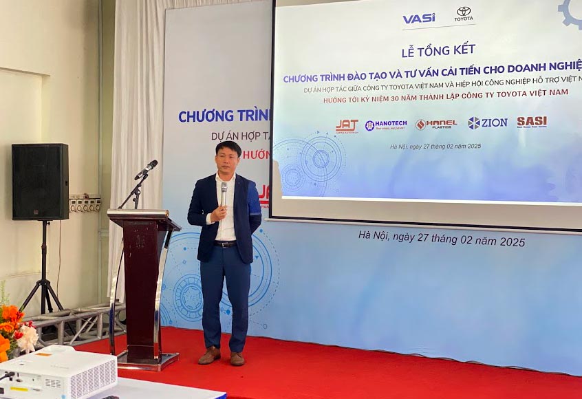 Chuyên gia của Toyota chia sẻ tại Lễ tổng kết Chương trình đào tạo và tư vấn cải tiến cho doanh nghiệp, thuộc dự án hợp tác giữa Công ty Toyota Việt Nam và Hiệp hội Công nghiệp hỗ trợ Việt Nam (VASI).