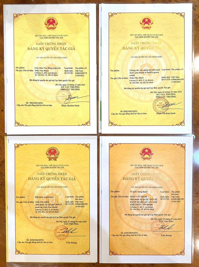 Giấy chứng nhận các ca khúc do Doanh nhân Trần Văn Mười sáng tác.