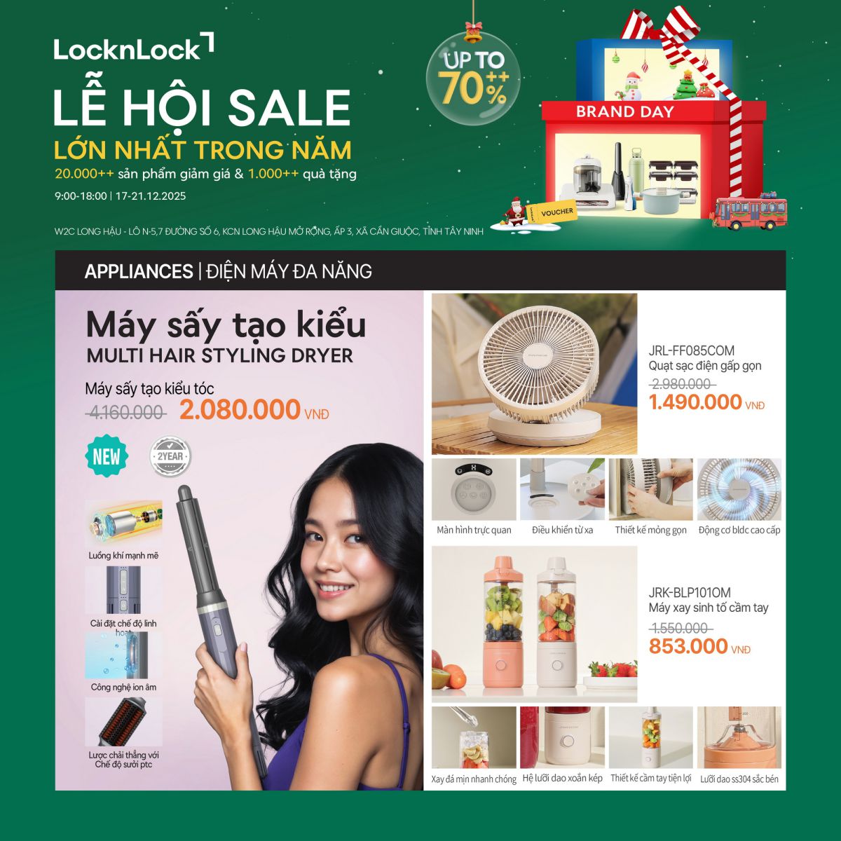 LocknLock Brand Day 2025 - Địa chỉ: Cửa hàng W2C Long Hậu, Lô N-5,7, đường số 6, KCN Long Hậu mở rộng, Ấp 3, Cần Giuộc, Tây Ninh. - Thời gian chương trình: 9h00-18h00 từ ngày 17/12-21/12/2025. - Truy cập Website https://locknlock.vn/ để không bỏ lỡ những ưu đãi hấp dẫn nhất này! - Hotline: 028 3713 5750 (HCM) |