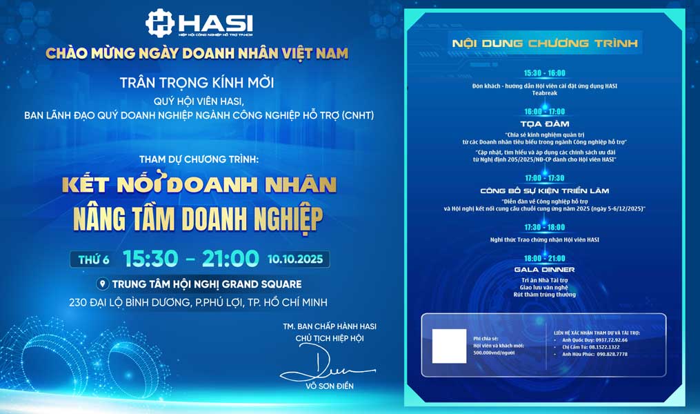 Chương trình nói trên sẽ diễn ra từ 15:30 đến 21:00, ngày 10/10/2025 (thứ Sáu) tại Trung tâm Hội nghị Grand Square (230 Đại lộ Bình Dương, P. Phú Lợi, TP.HCM),qua đó thúc đẩy tinh thần giao lưu, sẻ chia, hợp tác và tôn vinh doanh nhân, doanh nghiệp ngành Công nghiệp hỗ trợ (CNHT). Sự kiện trở nên rất ý nghĩa và thiết thực trong bối cảnh kinh tế toàn cầu biến động và chuỗi cung ứng dịch chuyển mạnh mẽ, CNHT đang trở thành “xương sống” của nền công nghiệp Việt Nam.