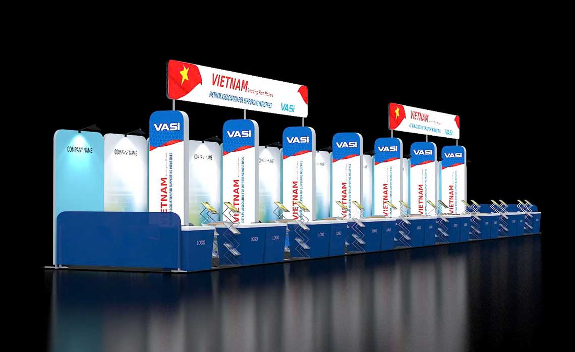 - Mỗi doanh nghiệp nhận 1 quầy trưng bày riêng, có diện tích tối thiểu bằng 1/2 gian hàng tiêu chuẩn, gồm: 1 quầy trưng bày sản phẩm, 1 giá catalog, 1 backdrop để treo poster. Các doanh nghiệp sẽ bốc thăm chọn vị trí của mình trong khu gian hàng Vietnam Pavilion được thiết kế chung.