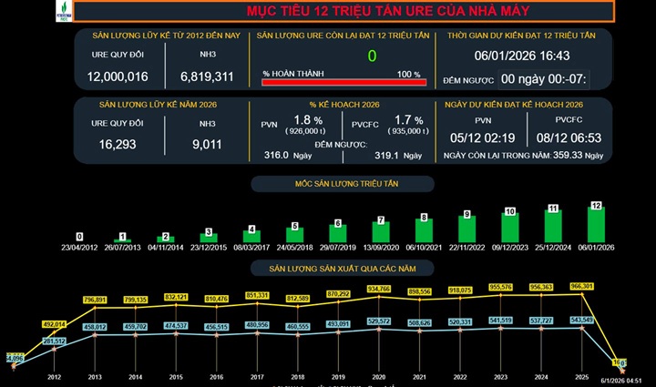 Vào lúc 16 giờ 43 phút ngày 06/01/2026, Nhà máy Đạm Cà Mau cán mốc sản lượng 12 triệu tấn Urea.