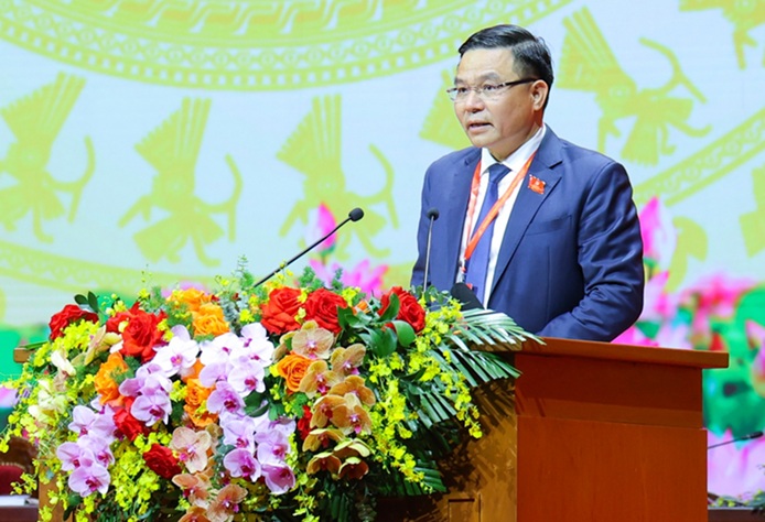 Bí thư Đảng ủy, Chủ tịch HĐTV Petrovietnam Lê Mạnh Hùng trình bày tham luận tại Đại hội đại biểu Đảng bộ Chính phủ lần thứ I.