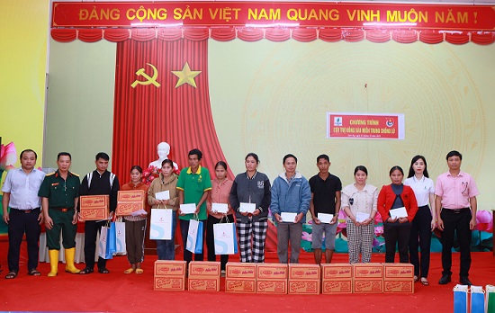 Đại diện xã Sơn Hạ và BSR trao các phần quà hỗ trợ cho người dân xã Sơn Hạ bị ảnh hưởng do mưa lũ