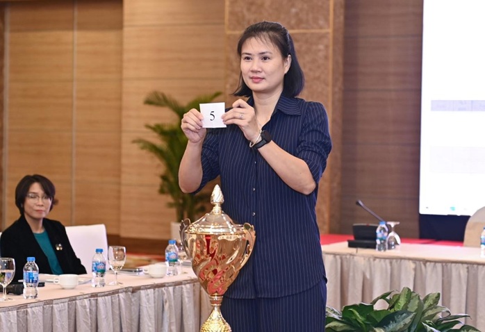 Huấn luyện viên Kim Huệ đại diện đội nữ Ninh Bình bốc thăm thi đấu.