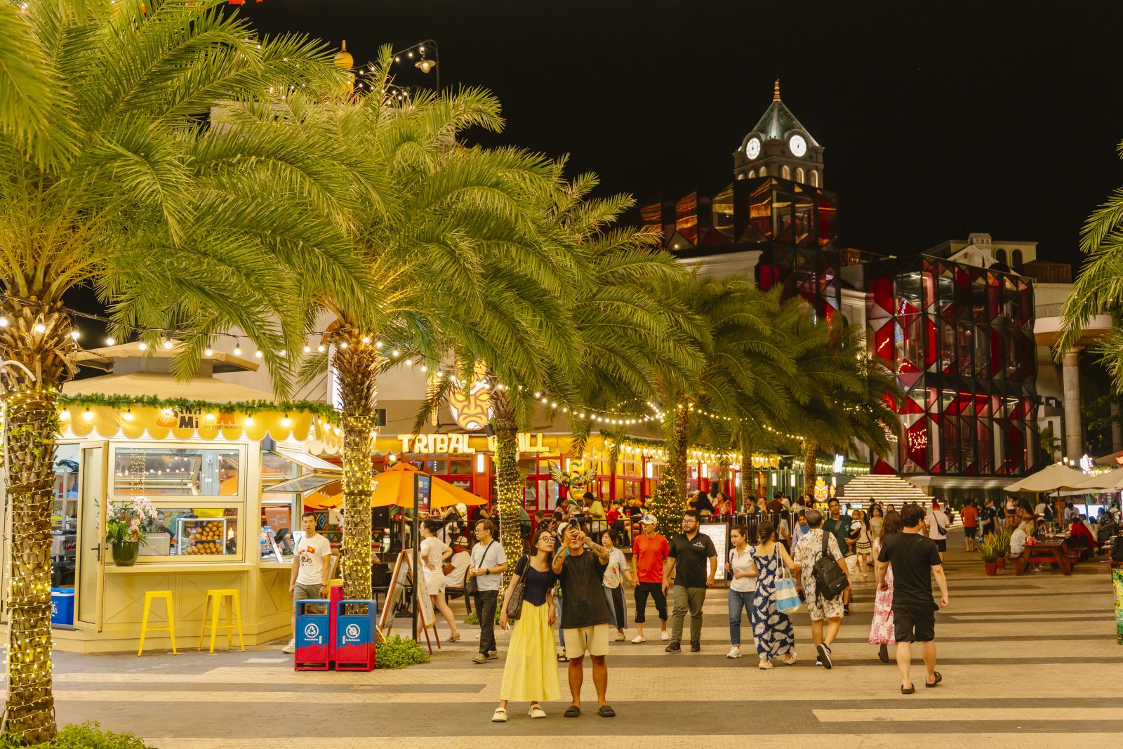 Không khí mua sắm và giải trí sôi động về đêm tại khu phố Sunset Bazaar.