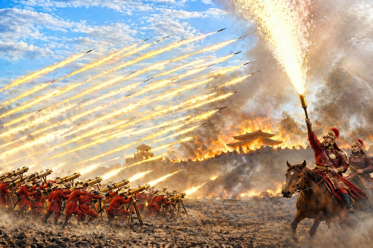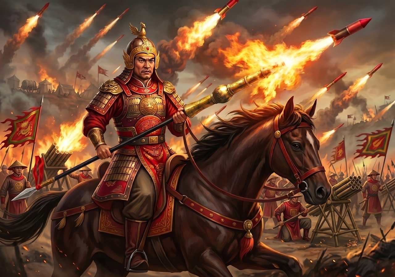 Đô đốc Trần Quang Diệu phóng tên lửa thiêu cháy hàng vạn quân Pháp / Ấn trong thành Quy Nhơn, y hệt như quân Thanh chết cháy ở gò Đống Đa. Ảnh: NVCC