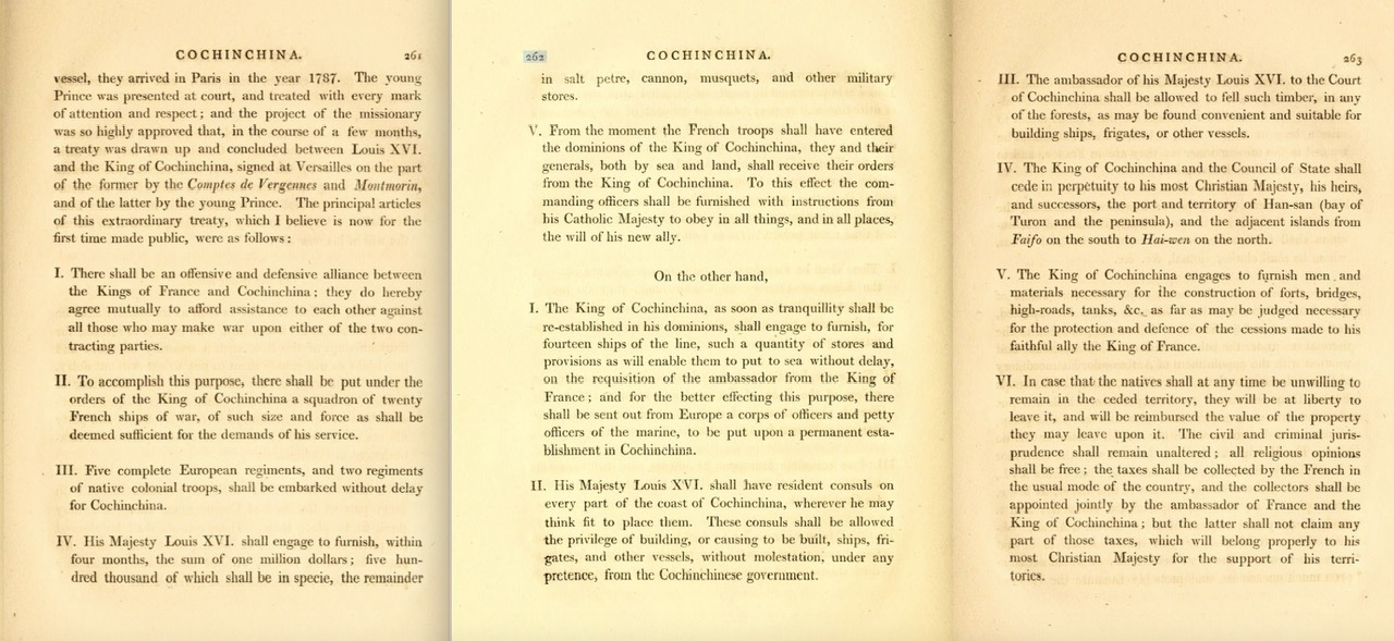 Xuyên suốt dòng chảy lịch sử, Hiệp ước Versailles 1787 chưa từng bị hủy bỏ hay giới hạn hiệu lực bởi bất kỳ chính quyền nào của nước Pháp, cũng như bởi Nguyễn Ánh trong mọi giai đoạn trị vì. Trái lại, dựa trên chính tấm bản đồ và bản hiệp ước này, thực dân Pháp đã liên tục đòi hỏi quyền lợi lãnh thổ, yêu cầu nhà Nguyễn giao nộp đất đai vào năm 1817 và đỉnh điểm là năm 1858 thời khắc chúng nã những phát súng đầu tiên, chính thức phát động cuộc chiến tranh xâm lược toàn diện Việt Nam.