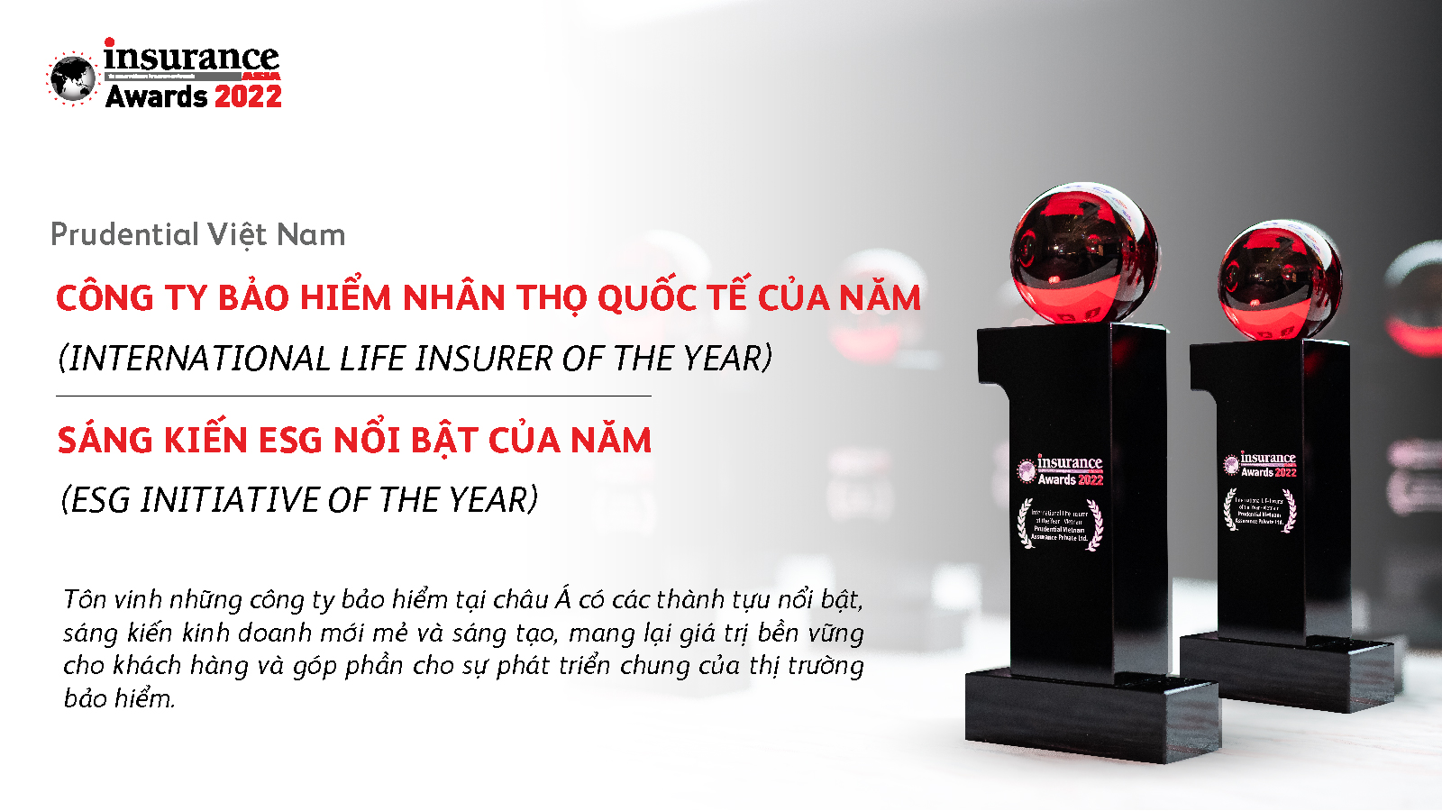 Chuỗi chiến thắng này tiếp tục khẳng định sự phát triển mạnh mẽ trong việc cung cấp giải pháp tài chính toàn diện của Prudential tại thị trường Việt Nam. Đây là năm thứ 4 liên tiếp Prudential được công nhận là “Công ty bảo hiểm nhân thọ quốc tế của năm” (International Life Insurer of the Year) và năm thứ 5 liên tiếp nhận danh hiệu “Nơi làm việc tốt nhất châu Á”. Đối với giải thưởng “Sáng kiến ESG của năm” (ESG Initiative of the Year)- giải thưởng dành cho những dự án thiết thực đóng góp trực tiếp giải quyết các vấn đề xã hội và phát triển bền vững, lần đầu tiên công ty được vinh danh với 2 dự án tiêu biểu là Giáo dục tài chính sớm cho trẻ Cha-Ching và Độc lập tuổi về già.