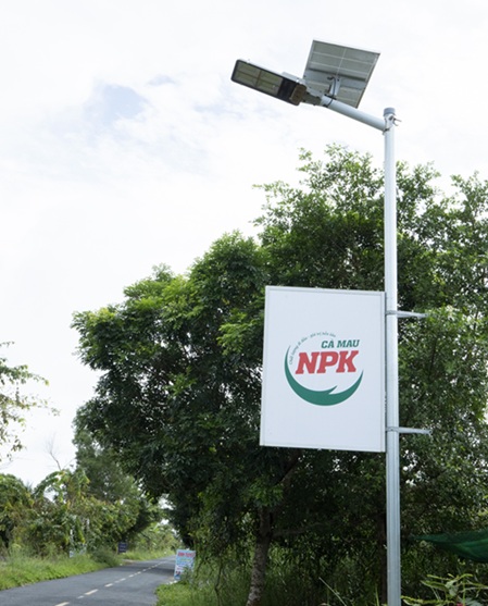 Hệ thống đèn chiếu sáng công cộng bằng năng lượng mặt trời do Phân Bón Cà Mau tài trợ được lắp đặt tại các tuyến đường dân sinh trung tâm xã Khánh An