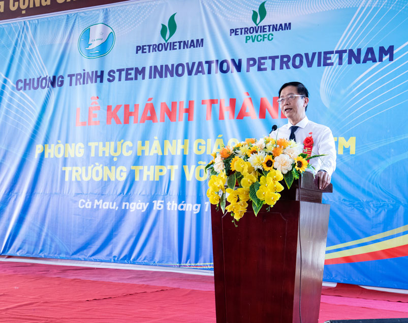 Đại diện lãnh đạo tỉnh Cà Mau, lãnh đạo Petrovietnam và các đại biểu thực hiện nghi thức khánh thành, chính thức bàn giao phòng học STEM trị giá hơn 3 tỷ đồng cho trường THPT Võ Văn Kiệt.