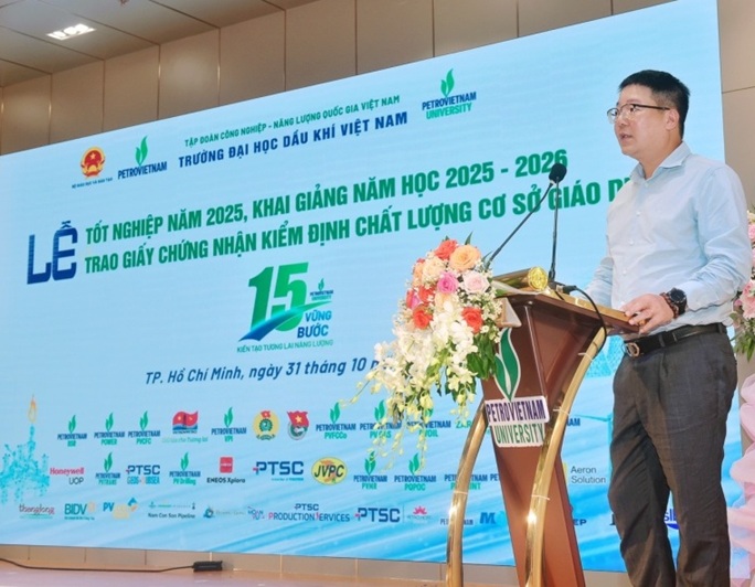 Phát biểu tại buổi lễ, ông Tạ Quang Huy - Phó Tổng Giám đốc PVFCCo - Phú Mỹ đã gửi lời chúc mừng đến PVU khi được trao Giấy chứng nhận kiểm định chất lượng cơ sở giáo dục, khẳng định uy tín và vị thế của Nhà trường trong hệ thống giáo dục đại học Việt Nam, đồng thời chúc mừng thầy trò PVU đã tổ chức buổi lễ tốt nghiệp trao bằng Thạc sĩ, kỹ sư và khai giảng năm học mới thật trang trọng và ấm áp.