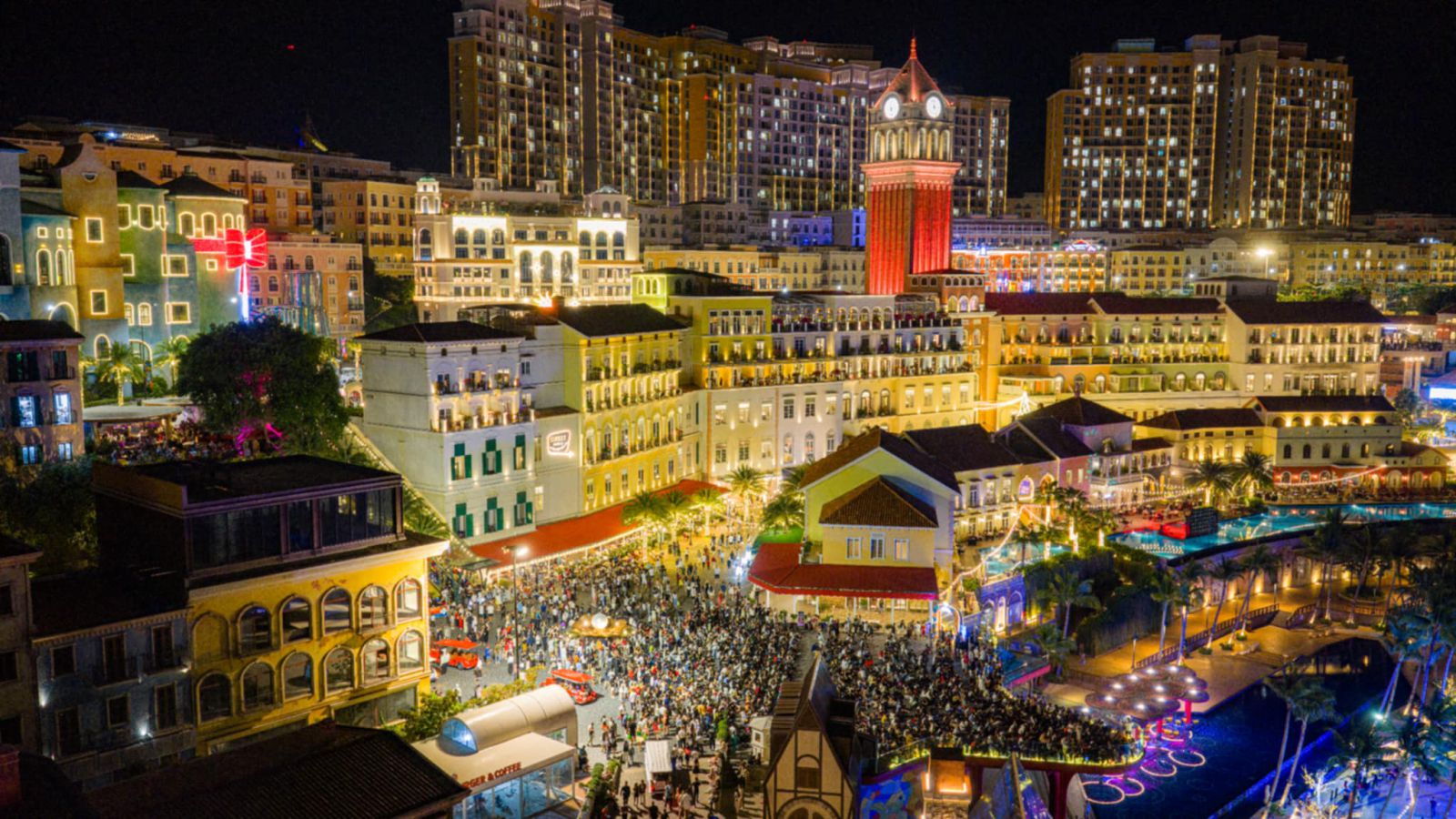 Trong kỳ nghỉ lễ, Thị trấn Hoàng Hôn tổ chức chương trình Spectacular Countdown 2026 với hơn 50 show diễn quy tụ 200 nghệ sĩ quốc tế, đỉnh cao là ba màn pháo hoa rực rỡ trong đêm giao thừa. Dọc các tuyến phố ven biển, nhà hàng, quán bar, cà phê và chợ đêm tại Thị trấn Hoàng Hôn luôn trong tình trạng kín chỗ, nhiều thời điểm không còn bàn trống ngay từ đầu buổi tối. Các tuyến phố thương mại rực sáng ánh đèn, dòng người tấp nập dạo bước, mua sắm và check-in tạo nên bức tranh lễ hội sôi động, đầy sắc màu, mang đến không khí náo nhiệt và giàu cảm xúc cho đảo Ngọc ngay từ những ngày đầu năm mới.