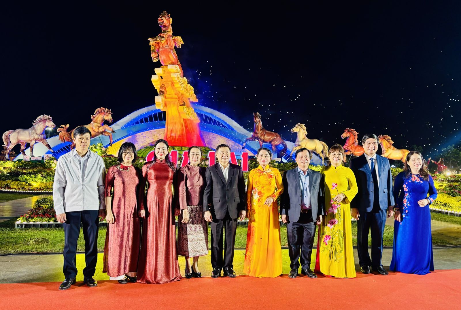 Lãnh đạo tỉnh Gia Lai và tỉnh Salavan (CHDCND Lào) chụp hình lưu niệm trước khu trưng bày cụm linh vật Xuân Bính Ngọ