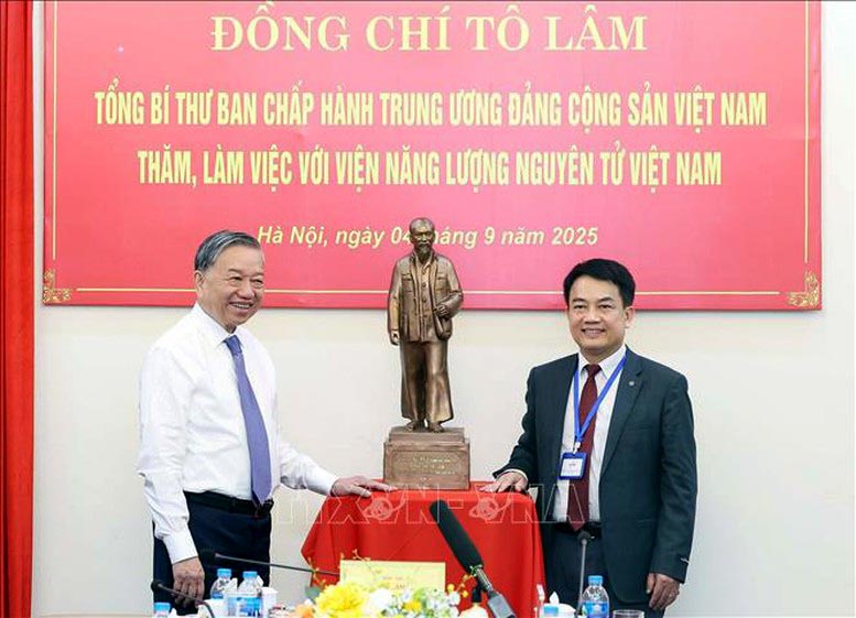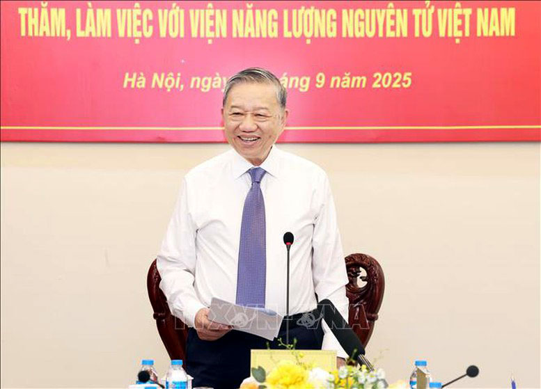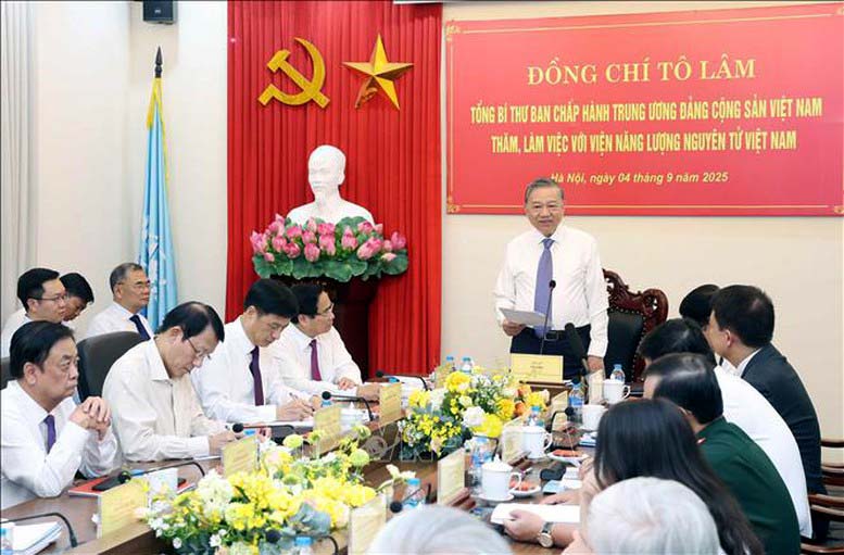 Sau khi nghe các ý kiến trao đổi tại buổi làm việc, phát biểu chỉ đạo, Tổng Bí thư Tô Lâm nhấn mạnh, trải qua gần nửa thế kỷ, Viện Năng lượng nguyên tử Việt Nam đã không ngừng trưởng thành, vươn lên và trở thành lực lượng tiên phong trong nghiên cứu ứng dụng năng lượng nguyên tử vì mục đích hòa bình. Đối với Việt Nam, điện hạt nhân không chỉ là một lựa chọn mà là một yêu cầu, khách quan, cấp thiết để đảm bảo an ninh năng lượng quốc gia, thực hiện cam kết trung hòa carbon và tạo động lực bứt phá cho công cuộc công nghiệp hóa, hiện đại hóa của đất nước.