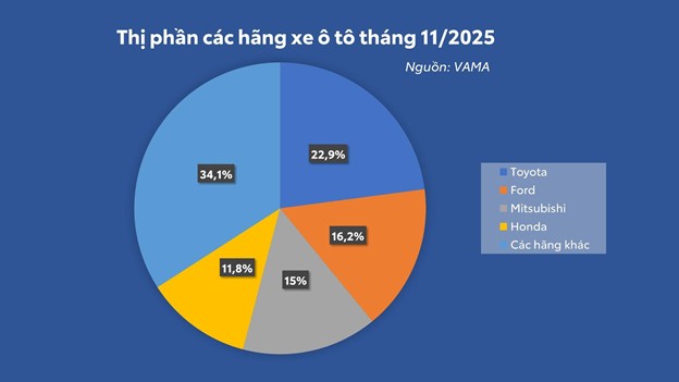 Tháng 11 vừa qua, doanh số toàn thị trường ô tô Việt Nam đạt 44.801 xe, nâng tổng tích lũy năm 2025 lên hơn 375.000 xe (Tổng hợp VAMA và Hyundai Thành Công). Toyota, Hyundai, Ford và Mitsubishi là 4 thương hiệu ngoại đạt doanh số cao nhất, lần lượt là 7.731 xe, 5.463 xe, 5.446 xe và 5.056 xe. Trong đó, tổng doanh số tháng của các thành viên VAMA đạt 33.689 xe.