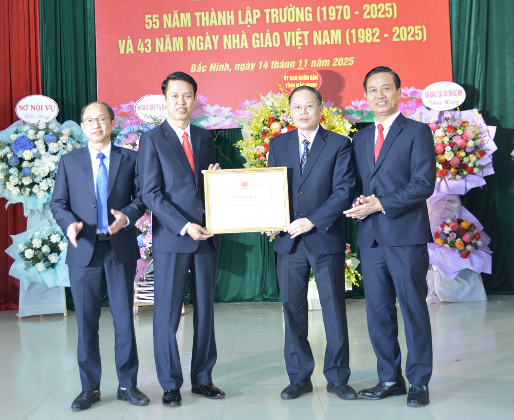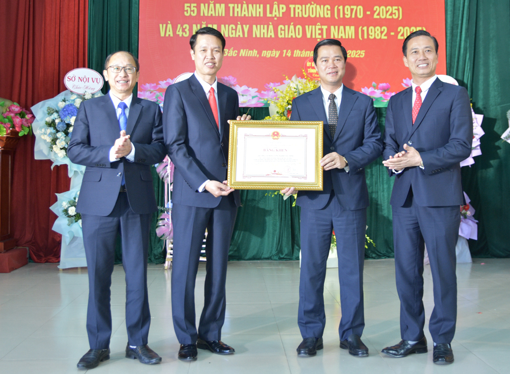 Ông Lê Xuân Lợi, Phó Chủ tịch UBND tỉnh Bắc Ninh trao Bằng khen cho Ban Giám hiệu nhà trường.