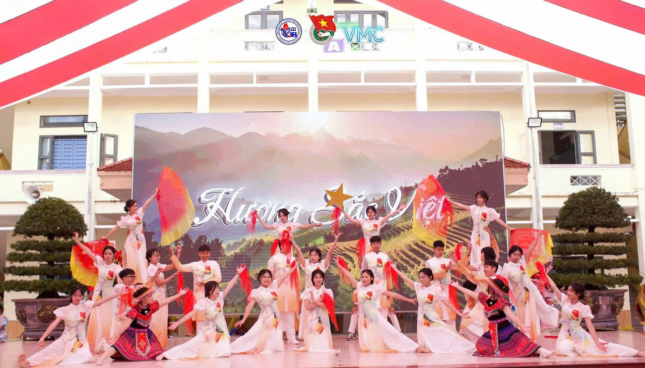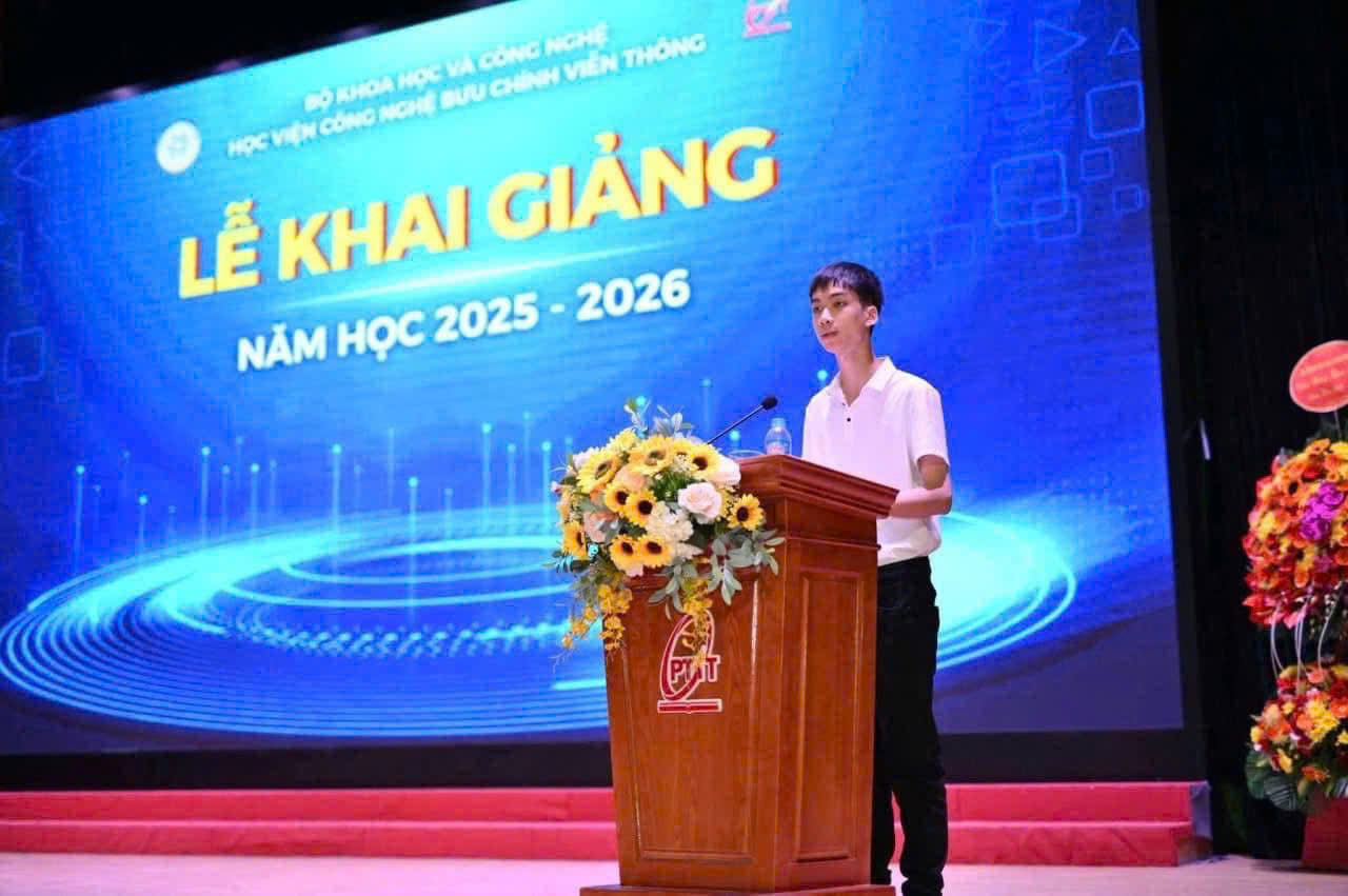 Em Nguyễn Huy Hoàng - Cựu học sinh Trường THPT Vĩnh Bảo - Thủ khoa đầu vào Học viện Bưu chính Viễn thông năm học 2025 - 2026 vinh dự phát biểu trong lễ khai giảng