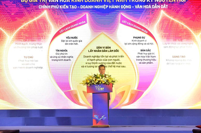 Tại Diễn đàn hôm nay, Phó Thủ tướng chính thức phát động và kêu gọi cộng đồng doanh nhân, doanh nghiệp Việt Nam thực thi và lan tỏa Bộ Giá trị văn hóa kinh doanh Việt Nam trong kỷ nguyên mới, góp phần xây dựng cộng đồng doanh nghiệp Việt Nam liêm chính, sáng tạo, trách nhiệm và hội nhập, đóng góp vào mục tiêu phát triển đất nước phồn vinh, hạnh phúc.