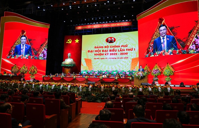 Bí thư Đảng ủy, Chủ tịch HĐTV Petrovietnam Lê Mạnh Hùng trình bày tham luận tại Đại hội đại biểu Đảng bộ Chính phủ lần thứ I.
