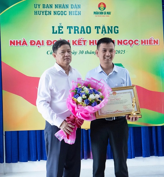 Đại diện Công ty Cổ phần Phân bón Dầu khí Cà Mau nhận bằng khen của Chủ tịch UBND tỉnh về thành tích đóng góp cho sự phát triển kinh tế - xã hội địa phương.