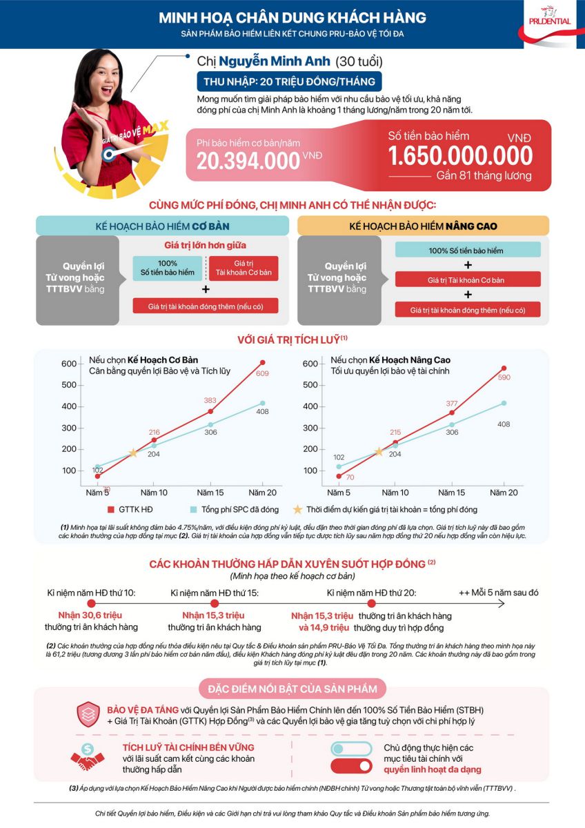 Công ty TNHH Bảo hiểm Nhân thọ Prudential Việt Nam ra mắt sản phẩm bảo hiểm liên kết chung PRU-Bảo vệ tối đa- Tối đa giá trị bảo vệ trên mỗi đồng phí, lên đến 80 lần(*) phí bảo hiểm cơ bản. Đây là sản phẩm bảo hiểm nhân thọ mới nhất của Prudential, đáp ứng nhu cầu bảo vệ ở mức độ tối ưu trên mức phí bảo hiểm phù hợp nhất với khả năng tài chính. Sản phẩm này còn được thiết kế nhằm tích lũy tài chính bền vững với lãi suất cam kết cùng các khoản thưởng hấp dẫn như thưởng tri ân khách hàng vào ngày kỷ niệm năm hợp đồng thứ 10 đầu tiên và mỗi 5 năm sau đó. Ngoài ra, khách hàng còn nhận được khoản thưởng duy trì hợp đồng vào từ Năm hợp đồng thứ 20 khi đáp ứng các điều kiện theo Quy tắc điều khoản sản phẩm.