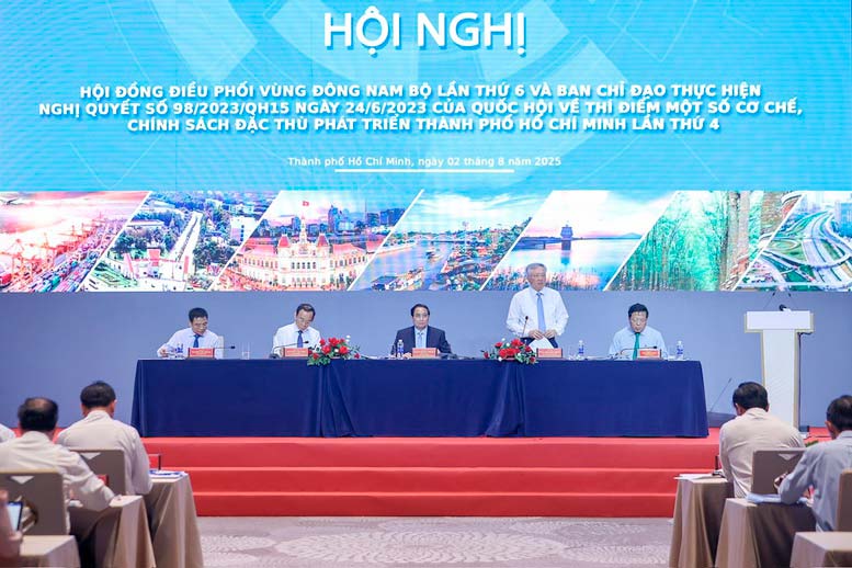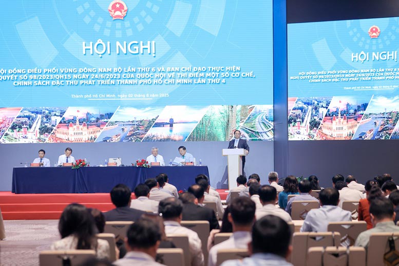 Thay mặt Chính phủ, Thủ tướng ghi nhận và biểu dương sự cố gắng, nỗ lực của Đảng bộ, chính quyền, quân và dân TPHCM, các tỉnh Đông Nam Bộ trong sắp xếp bộ máy, địa giới hành chính, phát triển kinh tế - xã hội, bảo đảm quốc phòng, an ninh, đối ngoại và hội nhập, bảo đảm đời sống nhân dân, đạt nhiều kết quả quan trọng, góp phần vào thành tựu chung của cả nước trong 7 tháng năm 2025.