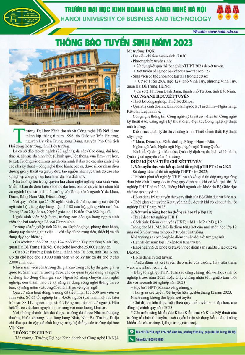 Năm nay Trường Đại học Kinh doanh và Công nghệ lê kế hoạch tuyển sinh với 7.030 chỉ tiêu. Phước thức tuyển sinh bằng 2 cách xét tuyển là: Sử dụng kết quả thi tốt nghiệp THPT 2023 và xét tuyển bằng học bạ theo kết quả học tập lớp 12.