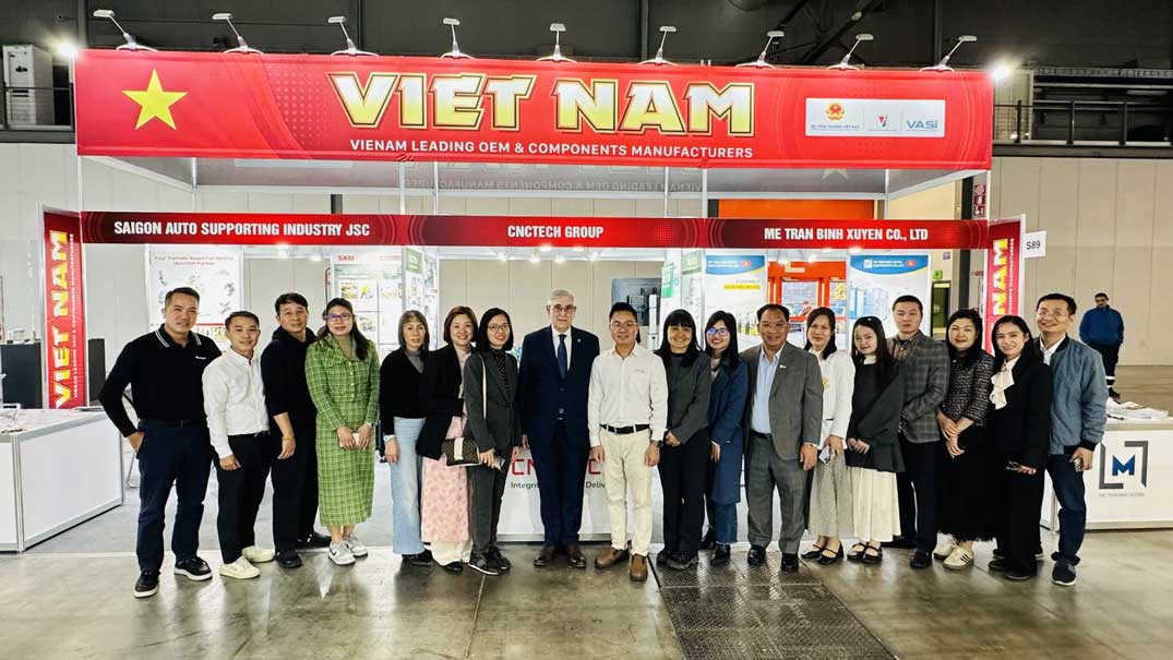 Ngày 4/11/2025, khu gian hàng hân hạnh được đón tiếp phái đoàn Thương vụ Việt Nam tại Italy tới tham quan và hỗ trợ kết nối. Thương vụ đã giới thiệu và mời đến thăm quan và kết nối tại gian hàng ông Walter Cavrenghi – Tổng thư ký Phòng Thương mại Italia Việt Nam. Ngay trong ngày đầu hội chợ, bà Trương Thị Chí Bình – Tổng thư ký kiêm Phó Chủ tịch Hiệp hội Công nghiệp hỗ trợ Việt Nam cho rằng doanh nghiệp CNHT Việt Nam có nhiều cơ hội tham gia chuỗi cung ứng của khách hàng Ý và EU trong lĩnh vực chế tạo, đặc biệt là xe hai bánh. Cuộc làm việc với Phòng Thương mại Italia Việt Nam còn cho thấy tiềm năng để doanh nghiệp Việt Nam trở thành đối tác, đại diện thương mại cho doanh nghiệp tại thị trường Việt Nam và ASEAN. Các công ty Việt Nam trưng bày tại Việt Nam Pavilion cũng đánh giá cao chất lượng và tiềm năng của các khách hàng đến làm việc tại triển lãm.