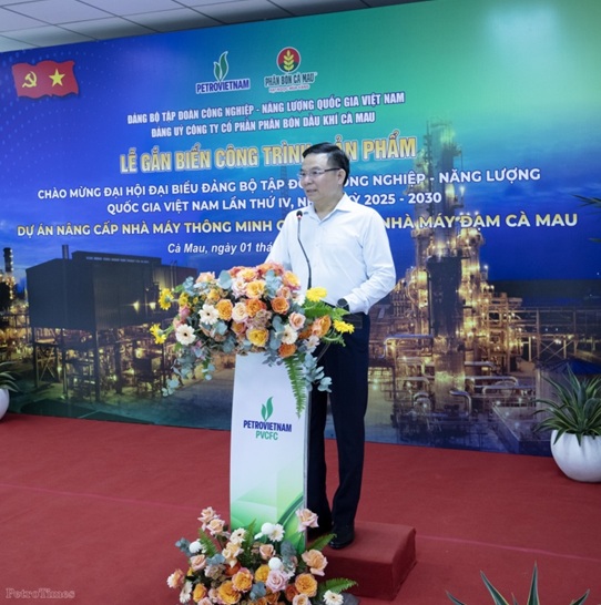 Đồng chí Lê Mạnh Hùng biểu dương và đánh giá cao đội ngũ PVCFC trong việc thực hiện chỉ đạo của Tập đoàn, trong thời gian ngắn đã nỗ lực hoàn thành đúng tiến độ công trình gắn biển chào mừng Đại hội Đảng bộ Petrovietnam lần IV - Dự án Nhà máy thông minh giai đoạn 1