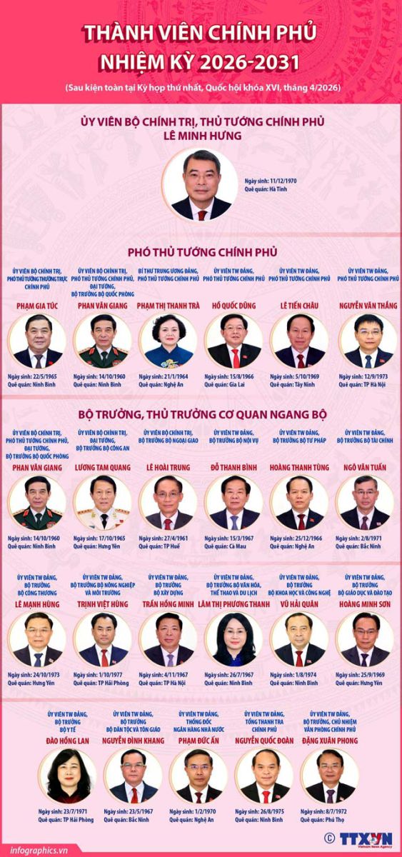 Theo đó, danh sách Bộ trưởng và thành viên khác của Chính phủ nhiệm kỳ 2026-2031 gồm các ông, bà: Ông Phan Văn Giang, Phó Thủ tướng Chính phủ kiêm Bộ trưởng Bộ Quốc phòng; Ông Lương Tam Quang, Bộ trưởng Bộ Công an; Ông Lê Hoài Trung, Bộ trưởng Bộ Ngoại giao; Ông Đỗ Thanh Bình, Bộ trưởng Bộ Nội vụ; Ông Hoàng Thanh Tùng, Bộ trưởng Bộ Tư pháp; Ông Ngô Văn Tuấn, Bộ trưởng Bộ Tài chính; Ông Lê Mạnh Hùng, Bộ trưởng Bộ Công Thương; Ông Trịnh Việt Hùng, Bộ trưởng Bộ Nông nghiệp và Môi trường; Ông Trần Hồng Minh, Bộ trưởng Bộ Xây dựng; Bà Lâm Thị Phương Thanh, Bộ trưởng Bộ Văn hóa, Thể thao và Du lịch; Ông Vũ Hải Quân, Bộ trưởng Bộ Khoa học và Công nghệ; Ông Hoàng Minh Sơn, Bộ trưởng Bộ Giáo dục và Đào tạo; Bà Đào Hồng Lan, Bộ trưởng Bộ Y tế; Ông Nguyễn Đình Khang, Bộ trưởng Bộ Dân tộc và Tôn giáo; Ông Phạm Đức Ấn, Thống đốc Ngân hàng Nhà nước Việt Nam; Ông Nguyễn Quốc Đoàn, Tổng Thanh tra Chính phủ; Ông Đặng Xuân Phong, Bộ trưởng, Chủ nhiệm Văn phòng Chính phủ.